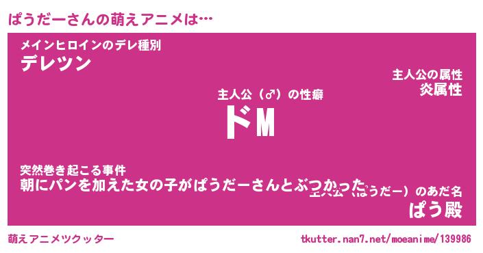 | 女子向けラノベタイトル風あだ名 | 『(仮)ぱうだーのやんごとなき事情』 |