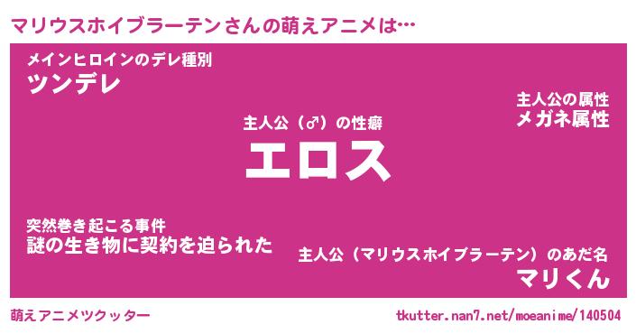 | 女子向けラノベタイトル風あだ名 | 『誰かこのマリウスホイブラーテンを説明してください! ~契約から始まるウェディング~』 |