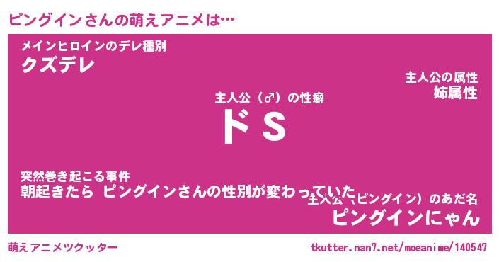 | 男性向けラノベタイトル風あだ名 | 『ピングインの憂鬱』 |