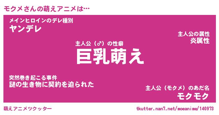 | 男性向けラノベタイトル風あだ名 | 『モクメの憂鬱』 |