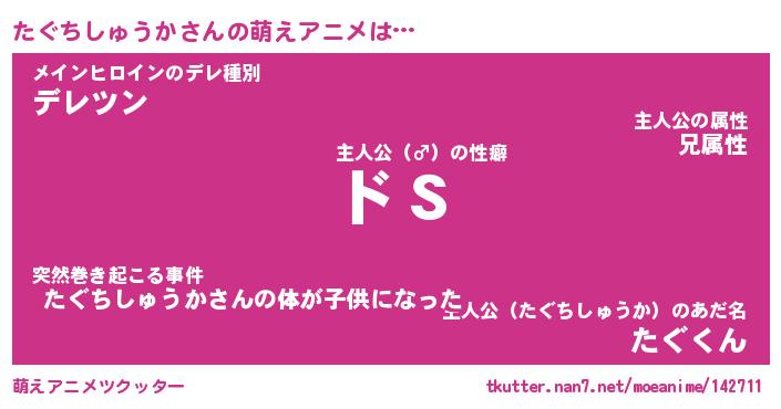 | 男性向けラノベタイトル風あだ名 | 『たぐちしゅうかの憂鬱』 |