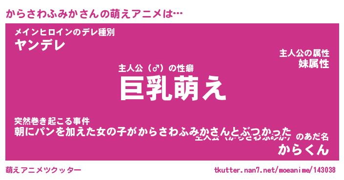 | 男性向けラノベタイトル風あだ名 | 『からさわふみかの憂鬱』 |