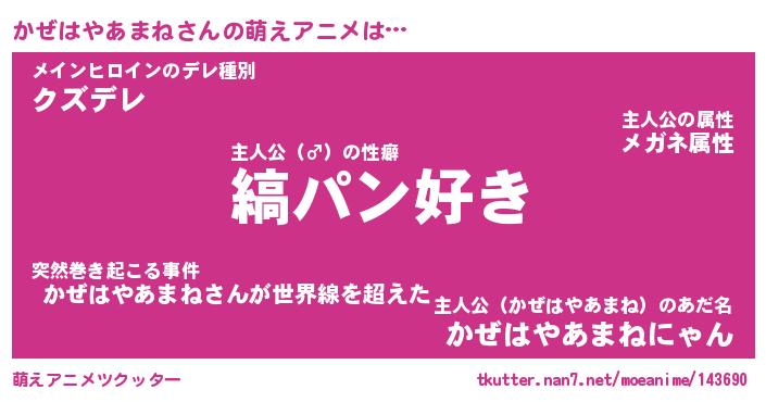 | 胡散臭い通販商品みたいなあだ名 | 『必ず成功するブレスレット…その名も「かぜはやあまね」』 |