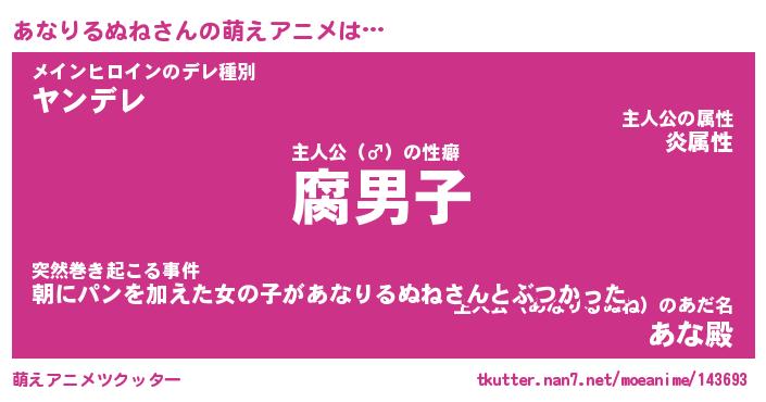 | 女子向けラノベタイトル風あだ名 | 『あなりるぬね姫と円卓の騎士』 |