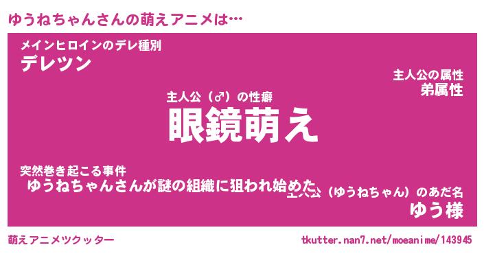 | 男性向けラノベタイトル風あだ名 | 『ゆうねちゃんの憂鬱』 |