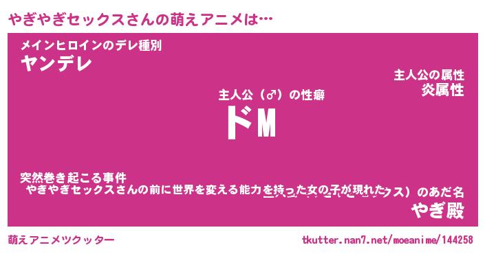 | 女子向けラノベタイトル風あだ名 | 『(仮)やぎやぎセックスのやんごとなき事情』 |