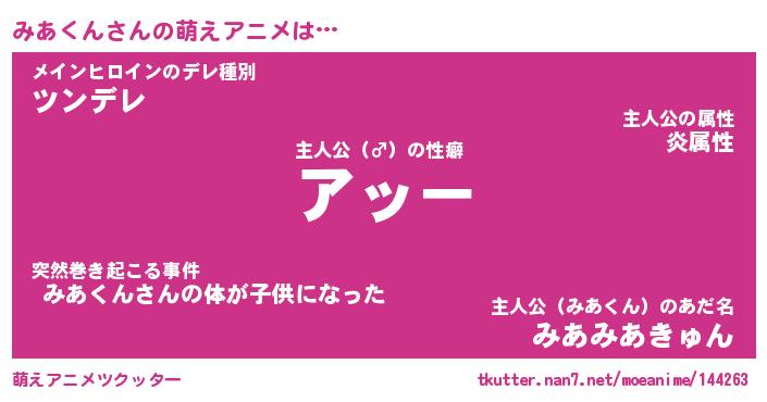| 男性向けラノベタイトル風あだ名 | 『ミアクンアートオンライン』 |