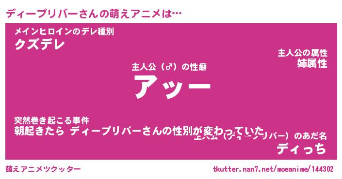 | 女子向けラノベタイトル風あだ名 | 『誰かこのディープリバーを説明してください! ~契約から始まるウェディング~』 |