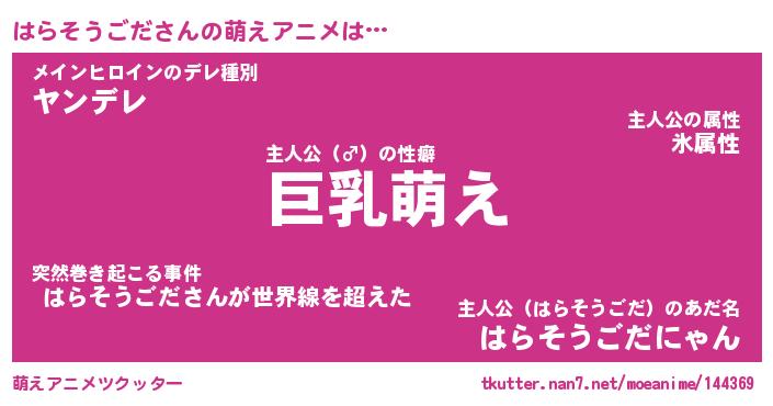 | 男性向けラノベタイトル風あだ名 | 『はらそうごだの憂鬱』 |
