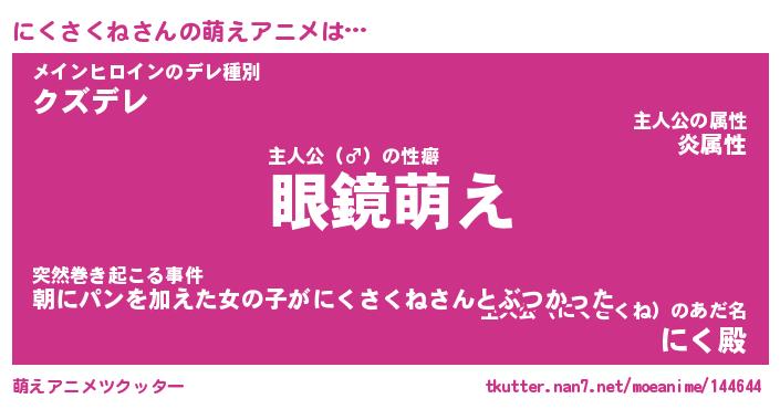 | 男性向けラノベタイトル風あだ名 | 『にくさくねの憂鬱』 |
