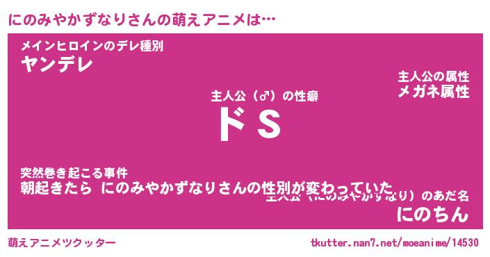 | 女子向けラノベタイトル風あだ名 | 『(仮)にのみやかずなりのやんごとなき事情』 |