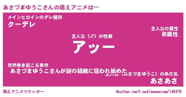 | 男性向けラノベタイトル風あだ名 | 『アサヅマユウコアートオンライン』 |