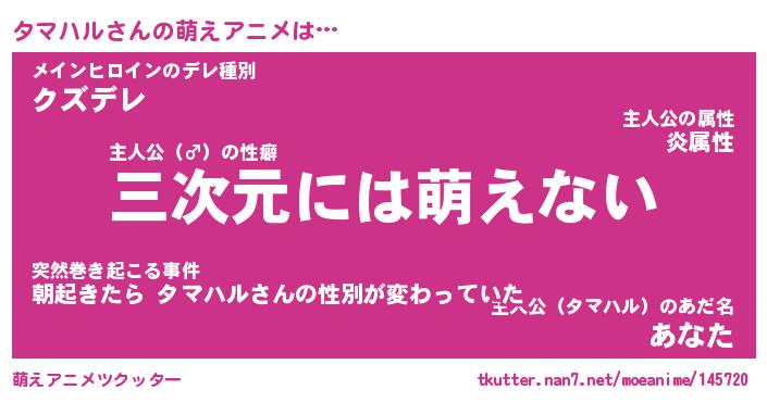 | 男性向けラノベタイトル風あだ名 | 『タマハルアートオンライン』 |