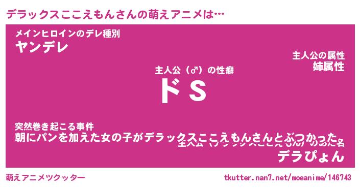| 男性向けラノベタイトル風あだ名 | 『デラックスここえもんの憂鬱』 |