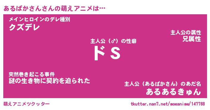| 女子向けラノベタイトル風あだ名 | 『(仮)あるぱかさんのやんごとなき事情』 |