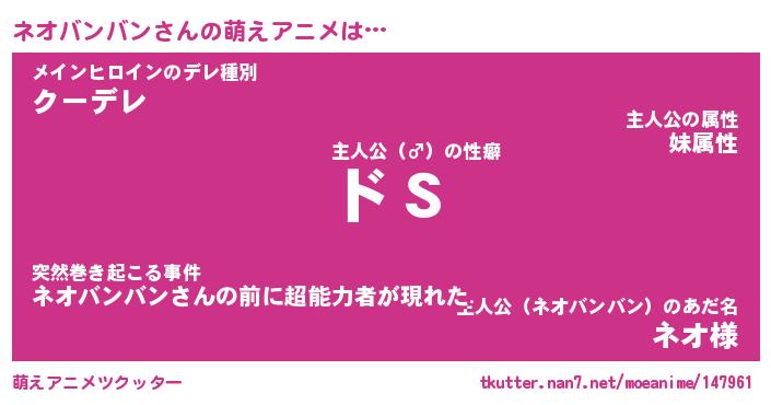 | 男性向けラノベタイトル風あだ名 | 『ネオバンバンの憂鬱』 |