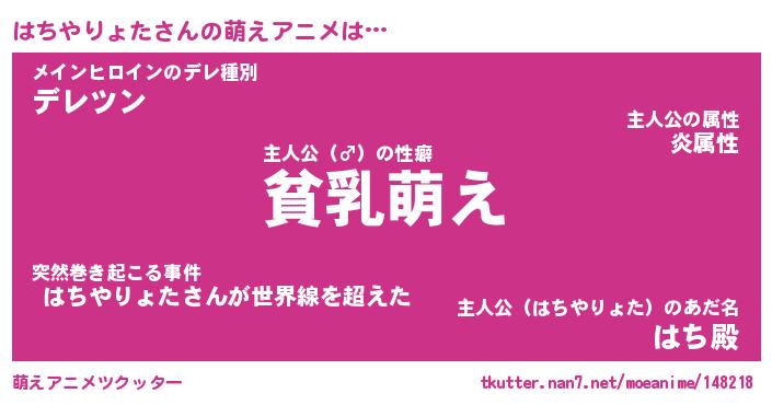 | 男性向けラノベタイトル風あだ名 | 『はちやりょたの憂鬱』 |