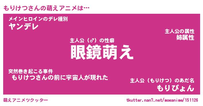 | 男性向けラノベタイトル風あだ名 | 『もりけつの憂鬱』 |
