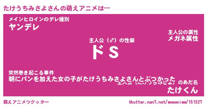 | 女子向けラノベタイトル風あだ名 | 『(仮)たけうちみさよのやんごとなき事情』 |