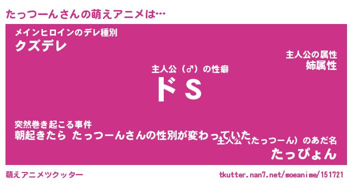 | 女子向けラノベタイトル風あだ名 | 『(仮)たっつーんのやんごとなき事情』 |