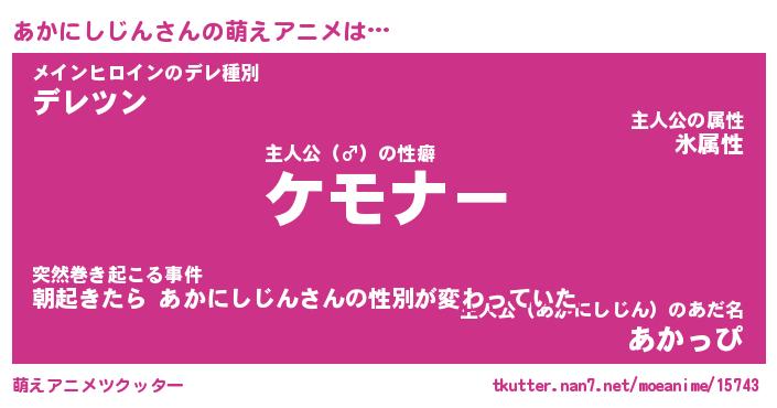 | 男性向けラノベタイトル風あだ名 | 『アカニシジンアートオンライン』 |