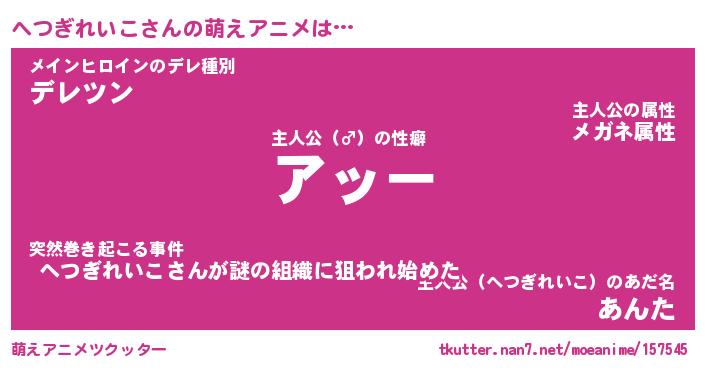 | 女子向けラノベタイトル風あだ名 | 『誰かこのへつぎれいこを説明してください! ~契約から始まるウェディング~』 |