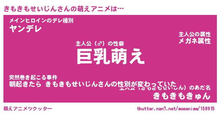 | 男性向けラノベタイトル風あだ名 | 『きもきもせいじんの憂鬱』 |