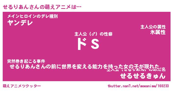 | 男性向けラノベタイトル風あだ名 | 『せるりあんの憂鬱』 |