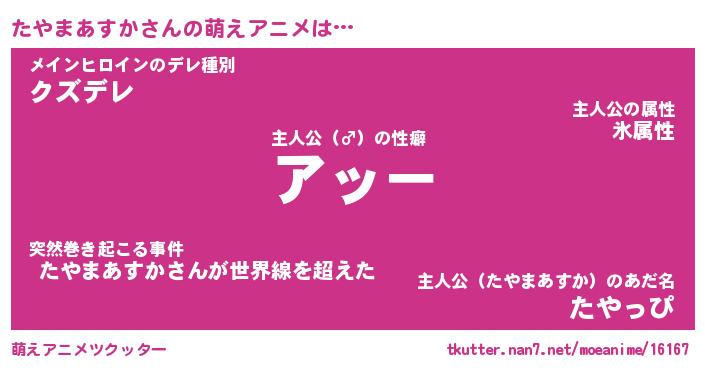 | 男性向けラノベタイトル風あだ名 | 『タヤマアスカアートオンライン』 |