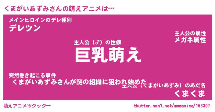 | 男性向けラノベタイトル風あだ名 | 『くまがいあずみの憂鬱』 |