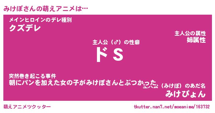 | ヘコむあだ名 | 『みけもー』『なまこ酢』『みけっ子』 |