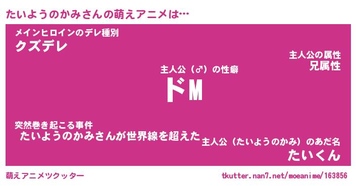 | 男性向けラノベタイトル風あだ名 | 『たいようのかみの憂鬱』 |