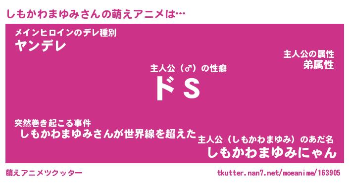 | 女子向けラノベタイトル風あだ名 | 『(仮)しもかわまゆみのやんごとなき事情』 |