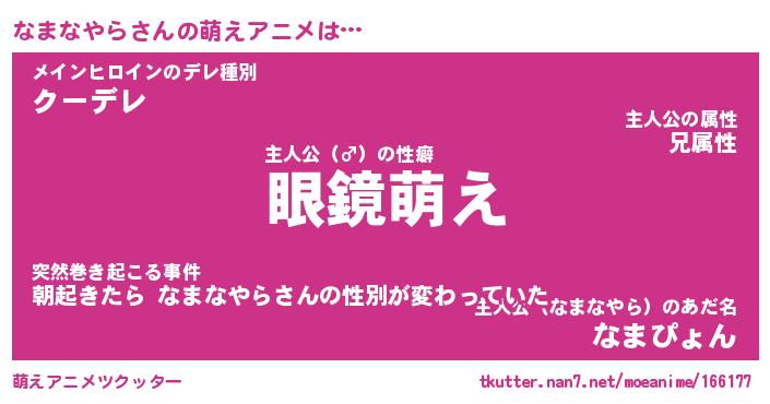 | 男性向けラノベタイトル風あだ名 | 『なまなやらの憂鬱』 |