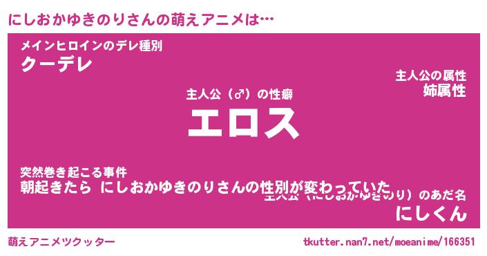 | 女子向けラノベタイトル風あだ名 | 『誰かこのにしおかゆきのりを説明してください! ~契約から始まるウェディング~』 |