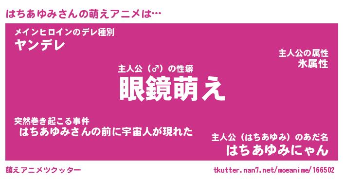 | 男性向けラノベタイトル風あだ名 | 『はちあゆみの憂鬱』 |