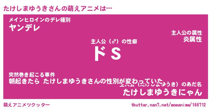 | 女子向けラノベタイトル風あだ名 | 『(仮)たけしまゆうきのやんごとなき事情』 |