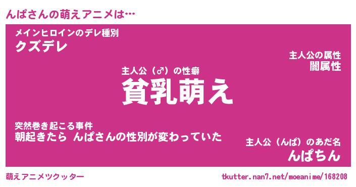 | 男性向けラノベタイトル風あだ名 | 『んぱの憂鬱』『ノーゲーム・ノーンパ』 |