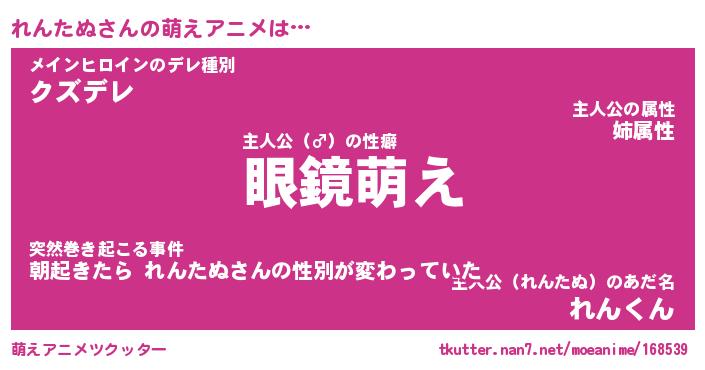 | 男性向けラノベタイトル風あだ名 | 『れんたぬの憂鬱』 |