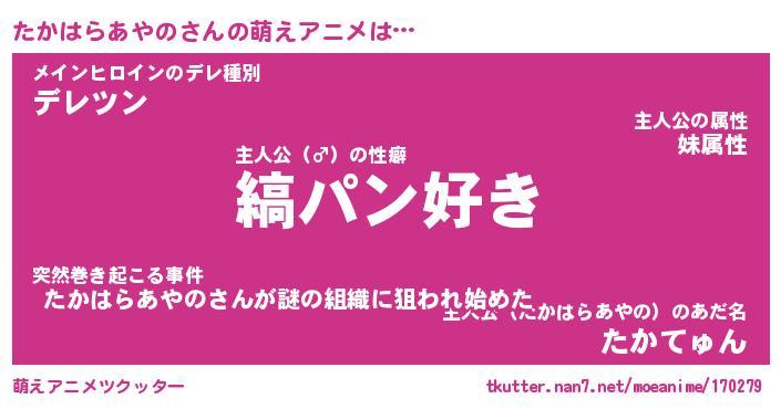 | 女子向けラノベタイトル風あだ名 | 『(仮)たかはらあやののやんごとなき事情』 |