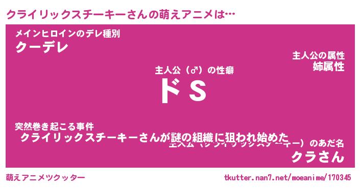| 男性向けラノベタイトル風あだ名 | 『クライリックスチーキーの憂鬱』 |