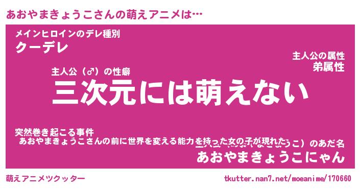 | 男性向けラノベタイトル風あだ名 | 『アオヤマキョウコアートオンライン』 |