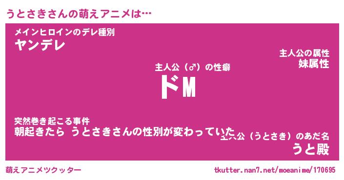 | 女子向けラノベタイトル風あだ名 | 『(仮)うとさきのやんごとなき事情』 |