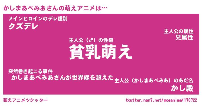 | 男性向けラノベタイトル風あだ名 | 『かしまあべみあの憂鬱』 |