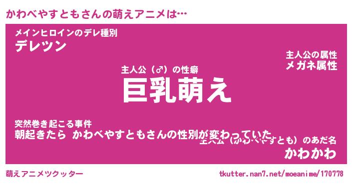 | 男性向けラノベタイトル風あだ名 | 『かわべやすともの憂鬱』 |