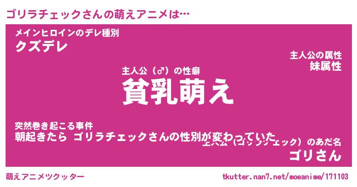 | 男性向けラノベタイトル風あだ名 | 『ゴリラチェックの憂鬱』 |