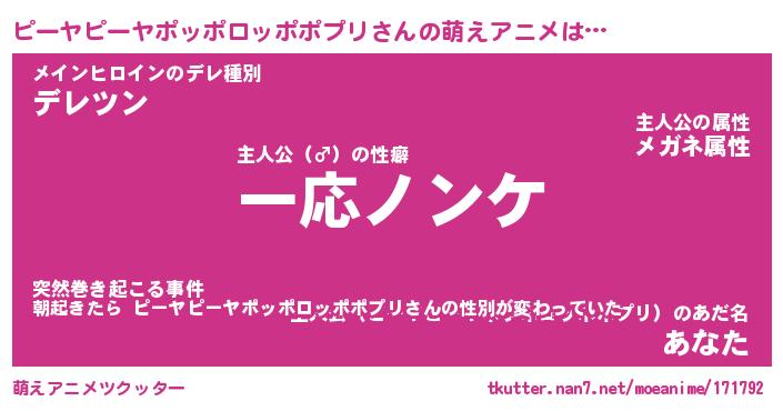 | 女子向けラノベタイトル風あだ名 | 『誰かこのピーヤピーヤポッポロッポポプリを説明してください! ~契約から始まるウェディング~』 |