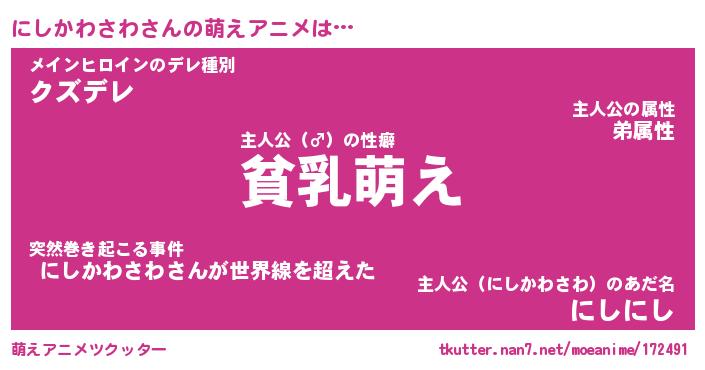 | 男性向けラノベタイトル風あだ名 | 『にしかわさわの憂鬱』 |