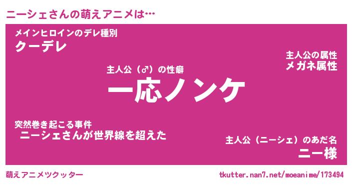 | 女子向けラノベタイトル風あだ名 | 『誰かこのニーシェを説明してください! ~契約から始まるウェディング~』 |
