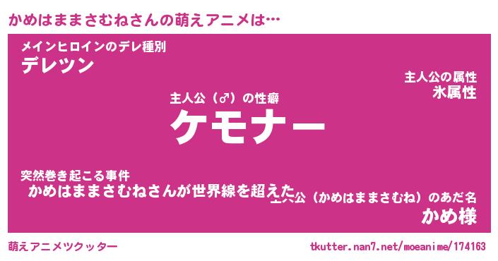 | 男性向けラノベタイトル風あだ名 | 『カメハママサムネアートオンライン』 |